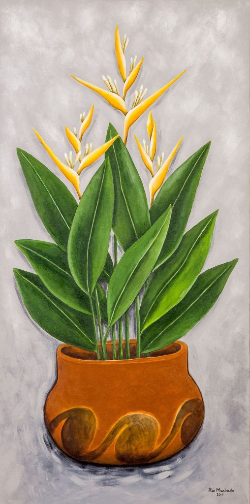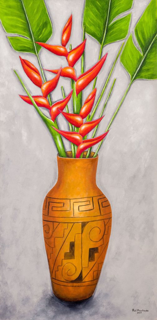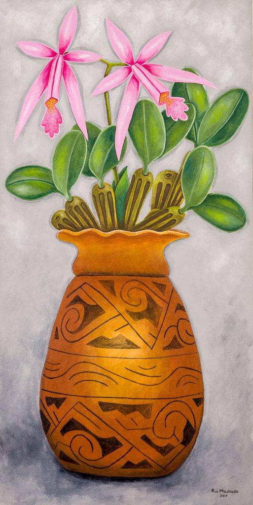 Para o Circuito de Artes Visuais da cidade de Manaus, apresento uma série de três trabalhos, intitulada Flores. Sempre ligado a temática amazônica, juntei algumas espécies exóticas da nossa flora e as coloquei dentro de cerâmicas de etnias indígenas, numa harmonia em que a natureza e arte dos povos da floresta se integram perfeitamente